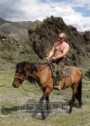 他刚柔相济。与人握手时,宽肩阔背加上厚重的手掌令你有“铁腕”之感,但他那坦诚而温和的蓝眼睛又似乎在传递俄罗斯的软实力。访日闲暇,他换上柔道服,把日本高手摔得服服帖帖;参观少林寺,他亲切地把小沙弥扛到肩头。他曾独自应邀到村妇家吃酸蘑菇,安慰这位孑然一身的孤老;他亲自开一辆崭新的国产小汽车,送给为老军人福利奔忙的耄耋退休女特工。村民邀他游泳,他二话没说就跳进河里;与运动员合影,他不拘形迹地蹲在前排。