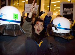 示威人群挥舞着鸢尾花旗(fleur-de-lis,波旁王朝复辟时,王室使用的旗帜),大喊口号,扔鸡蛋抗议。有的示威者坐在街道中间,导致查尔斯原定参加的出席仪式被迫取消。