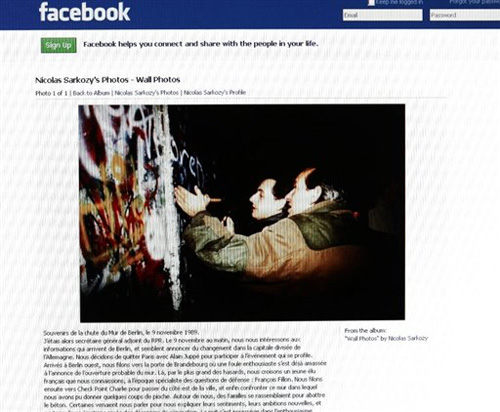前几天,萨科齐在社交网站facebook上发布了一张旧照片,显示他正在凿柏林墙,声称自己于1989年11月9日用铁镐见证了柏林墙的倒塌。