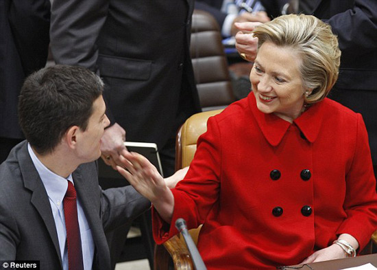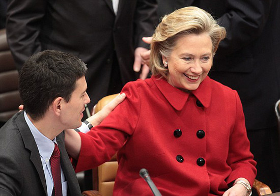 希拉里先前曾承认,对年轻的米利班德很有好感。当房间里的其他外交部长正为对阿富汗战争的讨论作准备时,希拉里和米利班德看起来像是一对过于激动的青少年。他们不时凝视对方,大笑,接触对方的肩部。希拉里有一次看起来还想伸手过来给米利班德作背部按摩。
