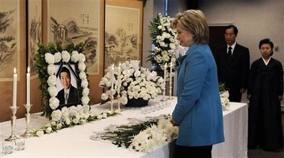 希拉里当天上午9时抵达大使馆,在韩国驻美大使韩德洙的带领下走向卢武铉的灵堂。在吊唁簿上签字,向灵堂献花,并进行了默哀。
