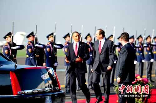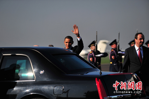 奥巴马总统于当地时间8日上午9时30分(北京时间8日15时30分)步下降落在布拉格鲁济涅老机场的“空军一号”专机舷梯。签字仪式在两个半小时后举行。