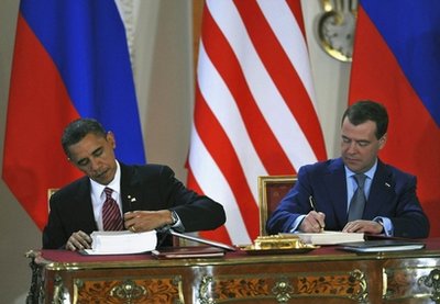 中新网4月8日电 综合媒体报道,俄罗斯总统梅德韦杰夫与美国总统奥巴马于当地时间4月8日中午在捷克首都布拉格签署了两国关于削减进攻性战略武器的新条约。