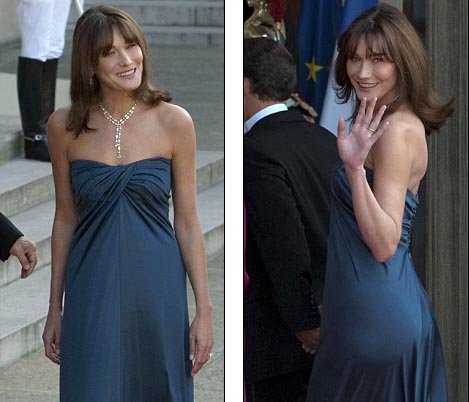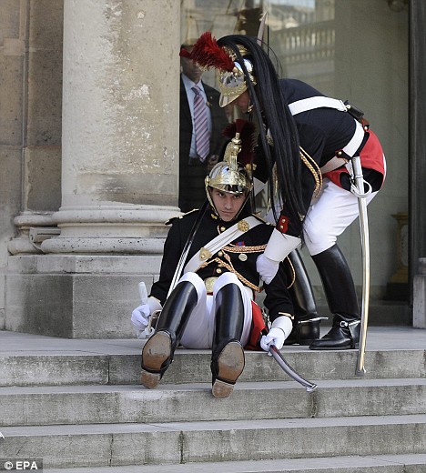 22日,法国总统萨科齐和夫人布鲁尼接待前来法国访问的卡塔尔埃米尔夫妇。在结束各项接待礼仪后,萨科齐牵着布吕尼的手走进爱丽舍宫。而在与守候在外的记者告别前,布鲁尼仍不忘微笑挥手,这时的前超级名模可谓“回眸一笑百媚生”。正当记者们狂按相机时,站在爱丽舍宫正门外台阶上的一名卫兵也“激动的不行”,以致眼神发直,腿软倒地,另外一名卫兵见状赶紧上前搀扶。