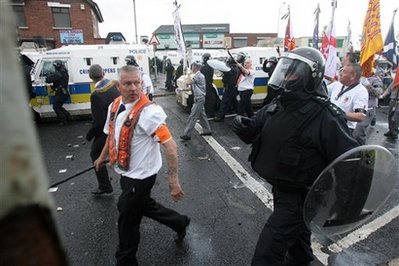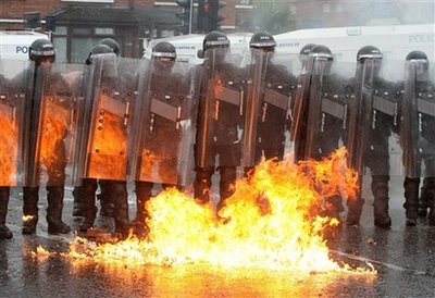 13日晚,在贝尔法斯特参加游行的新教徒向防暴警察投掷汽油弹、焰火和砖块,警察则以高压水枪还击。在双方的对峙中,警方至少开出一枪,而有6枚燃烧弹被掷向了防暴警察。