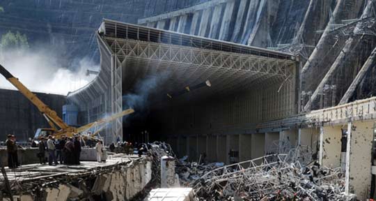 俄罗斯最大水电站萨彦-舒申斯克水电站位于俄西伯利亚地区哈卡斯共和国境内,17日清晨,在工作人员执行维修工作时,一个变压器爆炸,毁坏了引擎室里的墙壁和天花板,并导致室内水管压力激增而爆裂,引擎室被水淹没,造成水灾。据悉,水电站大坝本身没有受损,也没有对当地居民点造成威胁。