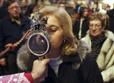 上周,一名51岁的男子因感染甲流,在那不勒斯医院不治身亡,成为意大利第一例甲流致死病例。由此,周一,天主教那不勒斯教会与城市当局共同决定,为预防甲流病毒大规模传播,将禁止信徒在本月晚些时候开始的宗教节日上亲吻装有圣人血液的玻璃小瓶。从9月19日开始,这樽装有天主教圣人圣亚努阿里乌斯血液的玻璃瓶将在那不勒斯市的主教座堂展出一周,展览期间,无论前来膜拜的信徒有多么虔诚,也不能用嘴亲吻瓶子,只能用额头轻触瓶子。