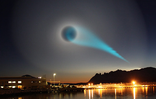 中新网12月11日电 美国总统奥巴马赴挪威领取诺贝尔和平奖前夕,挪威9日早晨出现神秘异象,一圈圈庞大的螺旋形光束笼罩整个天空,中心拖着一条蓝尾巴,历时10多分钟才消散,数以千计的挪威人目击事件,争相致电气象研究所查询,全球顶尖科学家和军事专家也啧啧称奇,有指是俄罗斯导弹发射失败,有指是北极光或外星人飞碟(UFO)。俄罗斯国防部发言人承认,前天早上试射“图锤”(又称布拉瓦)弹道导弹失败。