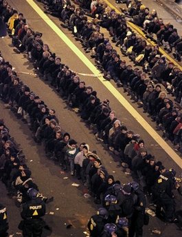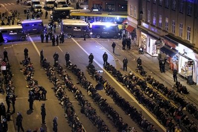 近日来,在哥本哈根举行的示威活动大部分是和平的,但是在当天的集会中,有数百名身穿黑衣的年轻人在街上投砖头,砸窗户,警方对此进行了干预。防暴警察包围了闹事者,要求他们坐在地上,把手放在身后,然后被集体押上警车。