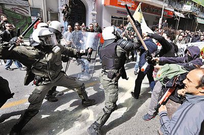 中新网3月12日电 综合媒体报道,为抗议政府紧缩财政的计划,希腊公务员和私营企业员工再度举行全国性大罢工。当地时间十一日,首都雅典举行的示威活动中爆发骚乱,数百名暴乱分子与希腊警方发生冲突,至少两名警察受伤。截至目前,希腊警方已经逮捕了至少九名暴乱者。
