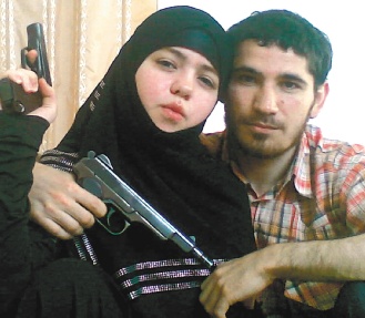 俄警方公布的2张照片中,她和丈夫甜蜜依偎,手里却分别拿着枪和手榴弹。