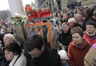 华沙广场上聚集着越来越多前来悼念的人群,年长的妇女手中紧握神像,年轻的夫妇手捧着郁金香,稚气未消的孩童带来了自己画的蜡笔画和心爱的玩具,他们都将自己的纪念品放在了装点着蜡烛的临时纪念场所。