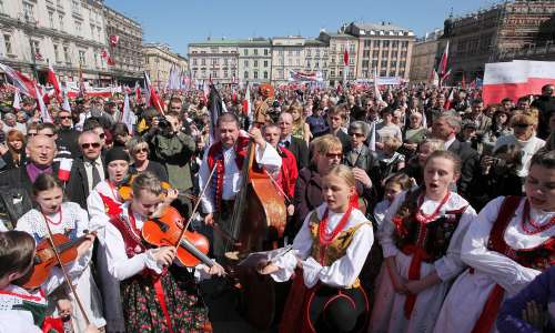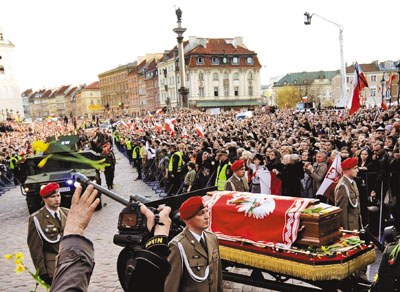 当灵车缓慢穿过克拉科夫狭窄街道时,哀悼者为卡钦斯基夫妇鼓掌、抛花和挥舞波兰国旗。卡钦斯基夫妇的遗体,是用飞机从华沙运抵这里的。