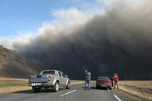 正在冰岛观察火山爆发的荷兰气象学家埃德温•詹尼表示:“现在,我们距离火山口大约有25公里远,正在观察一个洒满阳光的冰盖。它的上空有一片高达4公里至5公里的火山灰云柱,这简直是真正的地狱……”