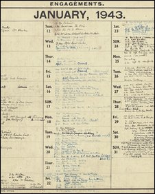 这本日志由丘吉尔的私人秘书保留了下来。它记录了丘吉尔与当时的美国总统罗斯福、苏联领导人斯大林等各国领袖的会晤,也包括丘吉尔每周二与英国国王的例常会晤。