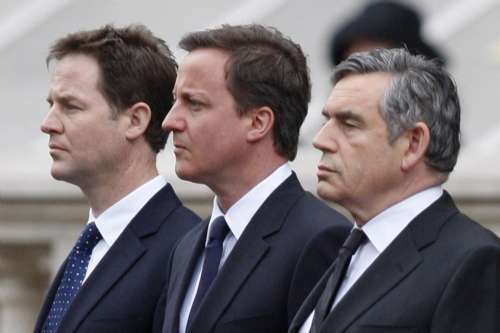 自民党党魁克莱格(左)、保守党党魁卡梅伦(中)及英国首相白高敦三人正在为组阁问题而博弈。(资料图)