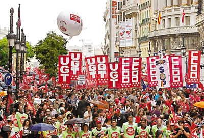 西班牙公务员前晚在全国发动60场大游行,抗议政府紧缩计划。工会称,全国260万公务员中,3/4参加了示威,但政府指只占11%。首都马德里有数千人参加游行,一名丈夫失业的女教师说,本月薪酬被削减150欧元,一想起便哭,家中储蓄正被蚕食。