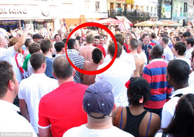 这名德国队支持者赤裸着上身,误入英格兰球迷阵营。他不断地被人群推搡,还遭到肘臂击撞。据悉,英格兰惨遭淘汰后,类似的骚乱事件还在英国其他街头和酒吧中发生。