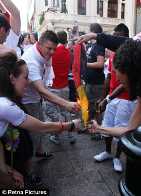 中新网6月28日电 据英国媒体报道,在英格兰三狮军团惨败给德国新战车后,一名德国队支持者遭遇聚集在伦敦莱切斯特广场观战的英格兰球迷的围堵。
