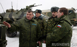 中新网1月15日电 据俄新网14日报道,俄罗斯总统德米特里·梅德韦杰夫由国防部长陪同在莫斯科州参观了新式履带式装甲运输车。