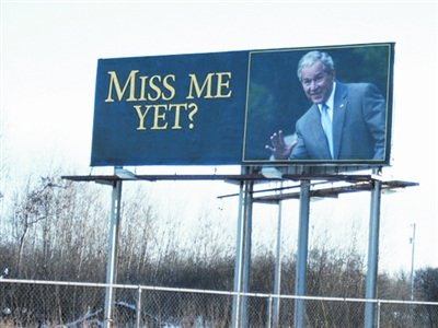 在广告牌上,右侧是一张小布什的照片,左侧是一句设计台词:“想我了吗?”