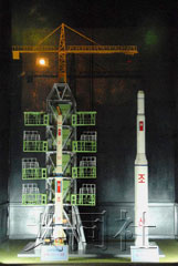 “银河2号”模型与“白头山1号”运载火箭模型并排展出。“白头山1号”曾于1998年8月发射了朝鲜的第一颗人造卫星“光明星1号”。“光明星2号”的四面被蓝色太阳能光板覆盖,顶部安装有通信天线。解说员向参观者介绍了发射情况和意义。