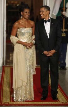 中新网11月25日电 据美国媒体报道,美国总统奥巴马24日晚首次在白宫摆国宴款待外宾,“第一夫人”米歇尔身着华丽晚装闪亮登场,整个国宴就像一场炫目的晚会。