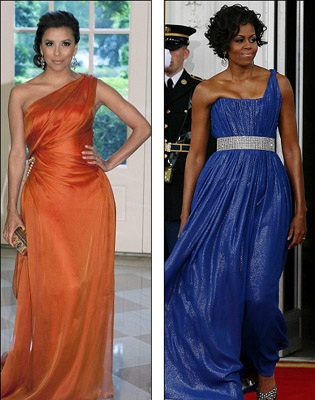 中新网5月20日电 据外媒报道,美国白宫19日举办国宴,款待墨西哥总统卡尔德龙夫妇。此间美国第一夫人的穿衣打扮再被媒体拿出来品头论足。不幸的是,这次米歇尔•奥巴马竟然与“绝望主妇”伊娃•朗格利亚大撞衫,颇为尴尬!