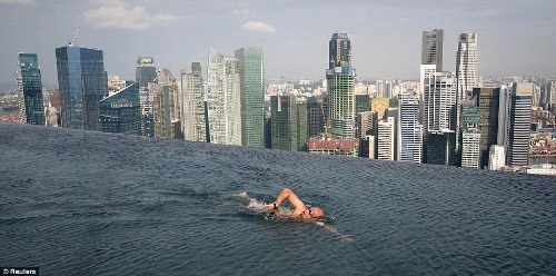 报道称,建在楼顶的泳池看起来如同水面延伸到地平线一般壮观。你可以一边游泳,一边俯瞰新加坡靓丽的城市风光。从泳池溢出的水会渗入到特别设计的集水区,并通过水泵和水处理系统重新回到泳池中。
