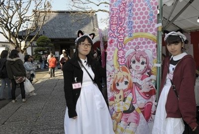 中新网11月23日电 许多人迷恋动画与漫画虚拟人物,这就是所谓的“萌”热潮,而最近这股流行风居然吹到了佛门净地。据台湾“东森新闻”报道,日本东京近郊的“了法寺”21日举行了女仆茶会,不但有美少女打扮成漫画女仆模样卖咖啡,寺庙前还摆设摊位展售各种与动漫相关的产品,堪称是日本最萌的寺庙。