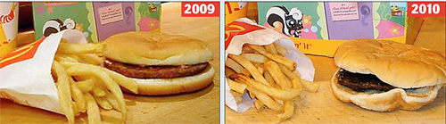 中新网3月20日电 同一份麦当劳“开心乐园餐”,相隔12个月拍下的两张照片,看起来竟然几乎一模一样。据香港《文汇报》报道,一般来说,放了一年的食物应该发霉或分解成一堆废料,但麦当劳儿童餐却几乎没有腐坏,只是汉堡牛扒萎缩和不新鲜的汉堡面包干裂。