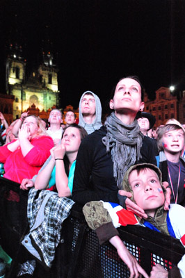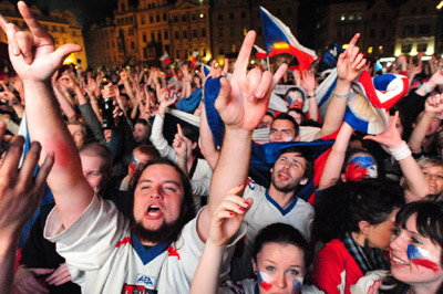 数千名球迷23日晚上聚集在布拉格市中心老城广场观看球赛的电视实况转播,捷克队最终取胜后人们一片欢腾。(黄频)