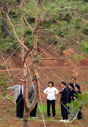 图为26日,权良淑女士和卢武铉的亲哥哥卢建平等相关人士以及几名风水先生在住宅后面的野山挑选用作已故前总统卢武铉的墓地场所。/ 照片:《朝鲜日报》