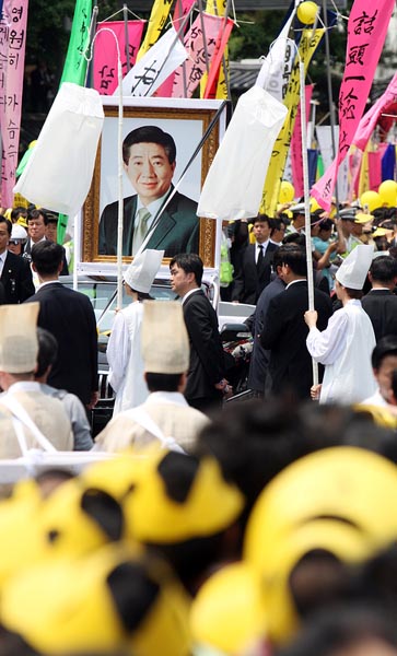 在景福宫遗体告别仪式结束后于中午12时30分出发的卢武铉的灵车,经由东十字阁、世宗路和太平路,于下午1时20分抵达首尔广场。