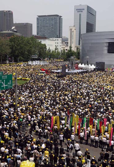 警方估算,首尔广场一带云集了18万名追悼者。大多数市民头戴象征故人的黄色太阳帽,并手持黄色气球追悼卢武铉。