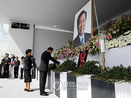 李明博当天与夫人金润玉女士和青瓦台政务首席秘书孟亨奎、发言人李东官一同进行了吊唁。
