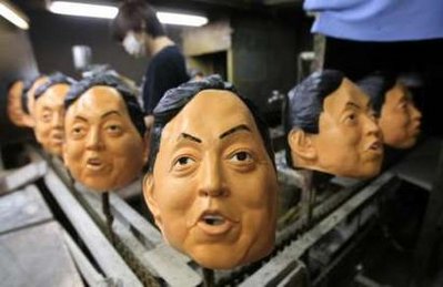 中新网9月5日电 在日本众院大选中民主党大胜后,模仿该党代表鸠山由纪夫样貌的橡胶面具正在吸引越来越多的人。与此相对,去年秋季刚发售时还算走俏的现任首相、自民党总裁麻生太郎的面具则有些卖不动了。两位党首在大选中鲜明的胜负之别同样反映在了面具的对决上。