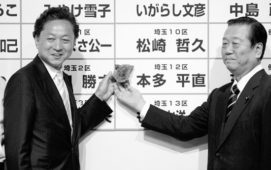 小泽一郎(右)是民主党众议院胜选的功臣。图为他和准首相鸠山由纪夫共同把玫瑰花插在当选的民主党候选人名字上