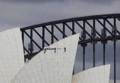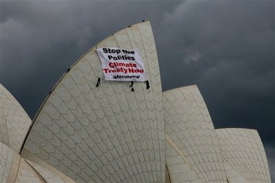 据报道,在哥本哈根召开的气候峰会上,发达国家和发展中国家两大阵营之间仍在僵持,各界对峰会结果的悲观情绪弥漫会场。15日,5名绿色和平组织成员抓着绳索爬上了悉尼歌剧院,并拉开一个100平米大的条幅,上面写着“不要再玩政治——立刻达成气候协议”。事后,这5人被警方逮捕。