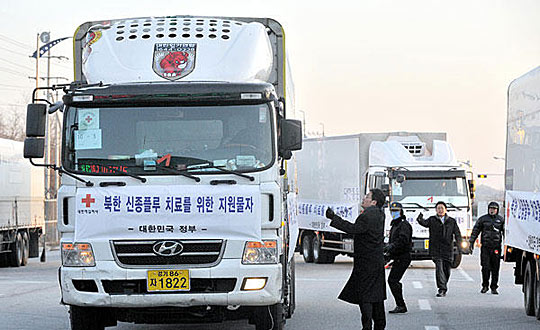 韩国支援团当天上午10点左右同朝方人员会面,利用1小时30分钟左右的时间将50万人份甲流感治疗药物转载在朝方的车辆上。此前,韩国政府从朝韩合作基金中划拨178亿韩元,用于购买治疗甲流的药物。