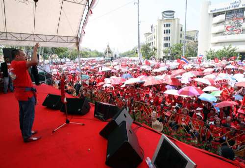 从十四日上午十时开始,素蓬、乍都蓬等红衫军领导人轮番登场发表演讲,不时赢得台下红衫军的阵阵掌声与喝彩。