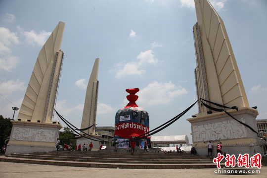 11日晚,红衫军在曼谷民主纪念碑附近集会,悼念在冲突中丧生的同伴。