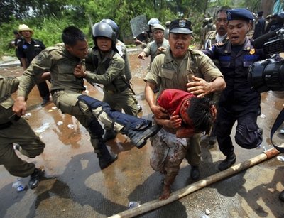 冲突发生在首都雅加达北部的丹戎不碌,该市发言人库尔尼亚(Cucu Kurnia)称,约2000名安保人员与600名警察用催泪弹、橡皮子弹、高压水枪与警棍驱散示威民众,。警方估计示威民众约有500人。