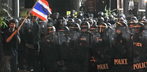 红衫军昨日继续示威,领袖纳塔兀表示,他们将继续以非暴力方法抗争,但其他领袖向集会示威者发言时,扬言发动“游击战”对抗,又威胁“攻入”大型商场。另一领袖乍都蓬说:“这里已溅出第一滴血,整个国家将成血浴之地。”