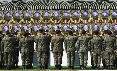 中新网4月26日电 据韩国《朝鲜日报》报道,韩国政府决定对天安舰46名遇难官兵各晋一级,并追授花郎武功勋章。遇难官兵联合葬礼将于25日至29日以海军葬方式举行,29日指定为国家哀悼日。