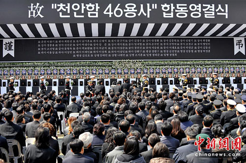 中新网4月29日电 据韩联社报道,在爆炸沉没事件中遇难的韩国警戒舰天安舰46名官兵的遗体告别仪式29日上午在韩国海军平泽第二舰队司令部内安保公园举行。