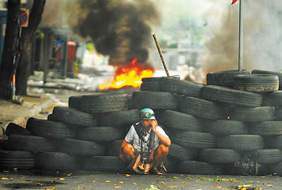13日,为了逼迫占据曼谷繁华商业区已近两个月的“红衫军”撤离,泰国政府切断了该商业区的水电供应,“红衫军”随即与军警发生冲突。16日,“红衫军”点燃了作为路障的汽车轮胎,一股股浓烟腾空而起。此外,他们还把警察设立的交通检查站泼上汽油并放火焚烧。