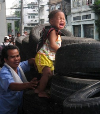 有关这名男童在示威者和泰国士兵对峙前线的视频已被上传至网站,包括妇女和儿童在内的5000名红衫军示威者正为军方把他们从营地里强行驱逐出去作准备。