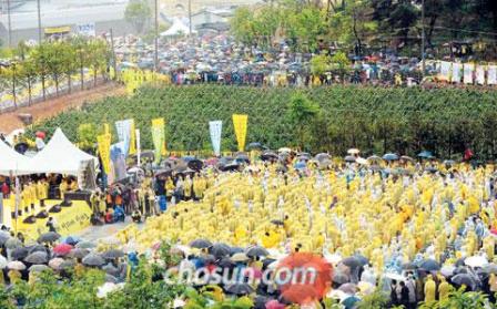 据报道,当天,在举行卢武铉逝世一周年追悼仪式的峰下村,大雨如注,然而前来追悼的客人仍然络绎不绝。