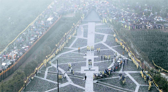 当天下午1点30分在墓前面的空地,追悼仪式开始了。现场上映了追悼前总统卢武铉的短片,追悼仪式现场人潮一度达到3万多名。